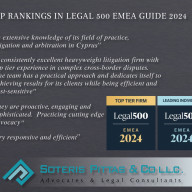 The prestigious Legal 500 EMEA - 2024 rankings have been published and SOTERIS PITTAS & CO LLC is delighted to announce that the firm is for, yet another year, highly ranked as a top tier law...