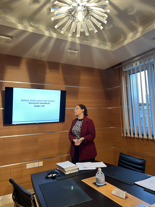 The seminar primarily focused on Article 146 of the Constitution of the Republic of Cyprus and the General Principles of Administrative Law 158/1999. The pleadings and procedures for the filing of a recourse, as well as the possible grounds of opposition, were also analyzed. The participants had the opportunity to discuss cases and practical examples regarding administration law and its procedures.